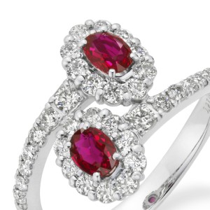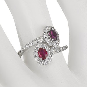 同じ大きさの二つの宝石が隣り合って、もしくは縦や斜めに向かい合ってセットされている指輪のデザインをトワエモワ(toi et moi )と呼びます。直訳しますと「あなたと私」という意味で、過去には婚約指輪にも使われた歴史があります。非加熱で同色のピジョンブラッドに合格したルビーを二つご用意して作成しております。