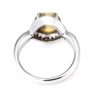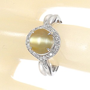 プラチナ枠も重厚な仕上がりですが、キャッツアイの厚みがあるので、枠自体の高さは抑えられています。様々な角度から見ても上質なキャッツアイの表情が感じられるのが魅力の商品です。