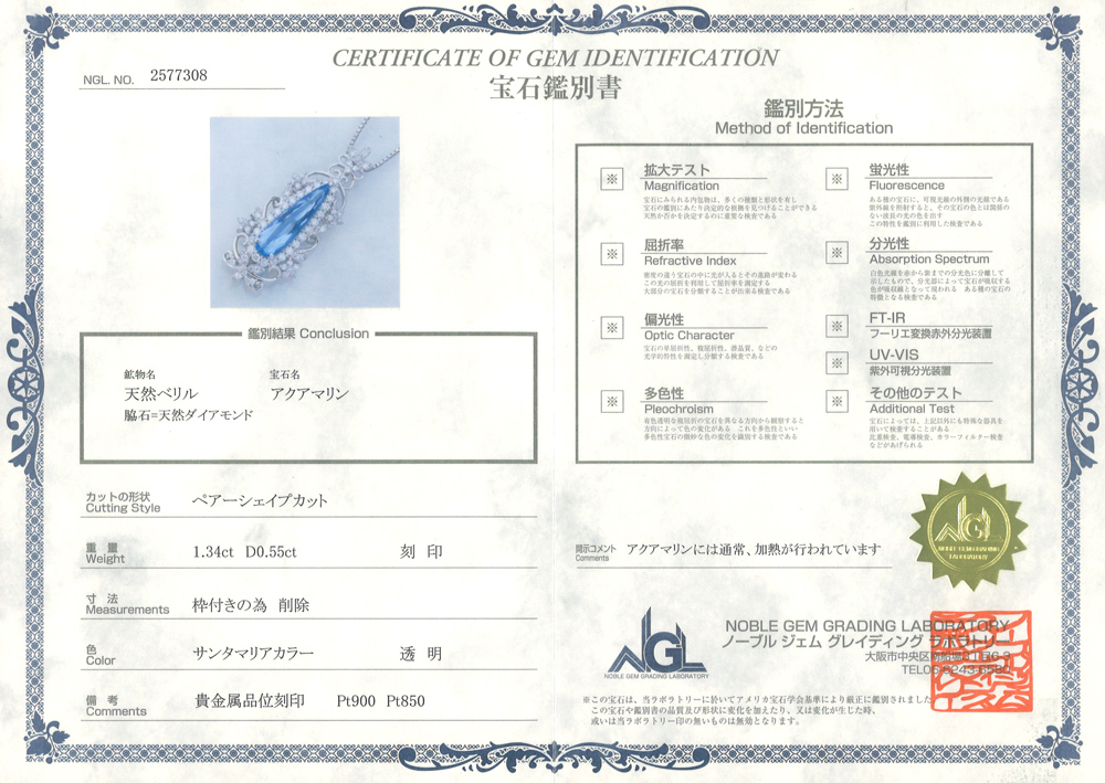 | 鑑別書 | ノーブルジェムグレイディングラボラトリー |