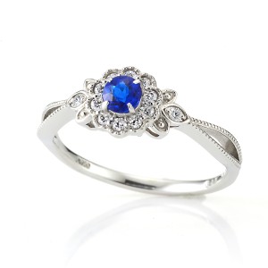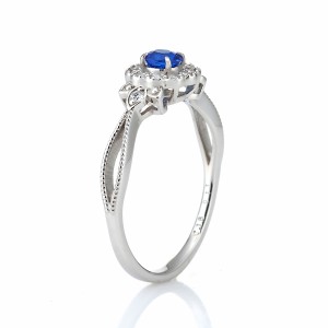 取巻きダイヤモンドの外周と両サイドの二つに分かれたアーム部分にミル打ち加工をして繊細かつ可憐な上質感が感じられます。