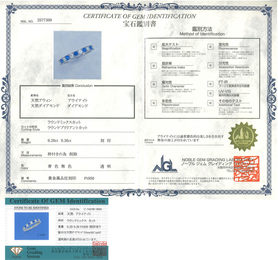 | 鑑別書 | ノーブルジェムグレイディングラボラトリー ジェムグレーディングシステムジャパン(H&Cに関して) |